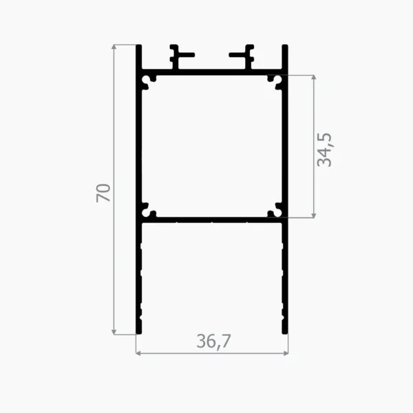 535S ASL Siyah Slim Sarkıt Armatür Profili, mimari aydınlatmada “Trafo Gizlemeli” (Driver-Inside) kasa olarak bilinen profesyonel serinin siyah versiyonudur. 70 mm yüksekliğindeki gövdesi iki bağımsız bölmeden oluşur; alt kısım LED aydınlatma için, üst kısım ise LED trafosunu (sürücüyü) yerleştirmeniz için boş bir hazne olarak tasarlanmıştır. Bu akıllı tasarım sayesinde tavanda harici trafo kutuları veya müdahale kapağı kullanmanıza gerek kalmaz; uygun ölçüdeki slim trafoları profilin içine saklayabilirsiniz. 34,1 mm genişliğindeki LED yatağı, yüksek ışık gücü gerektiren projelerde çoklu sıra şerit LED kullanımına olanak tanır. Statik Siyah Boyalı (RAL 9005) yüzeyi ve siyah vidalı metal yan kapakları, ürüne endüstriyel, premium ve sağlam bir karakter kazandırır. Koyu renk tavanlarda veya mimari bir vurgu elemanı olarak kullanıldığında dikkat çekici bir estetik sunar.