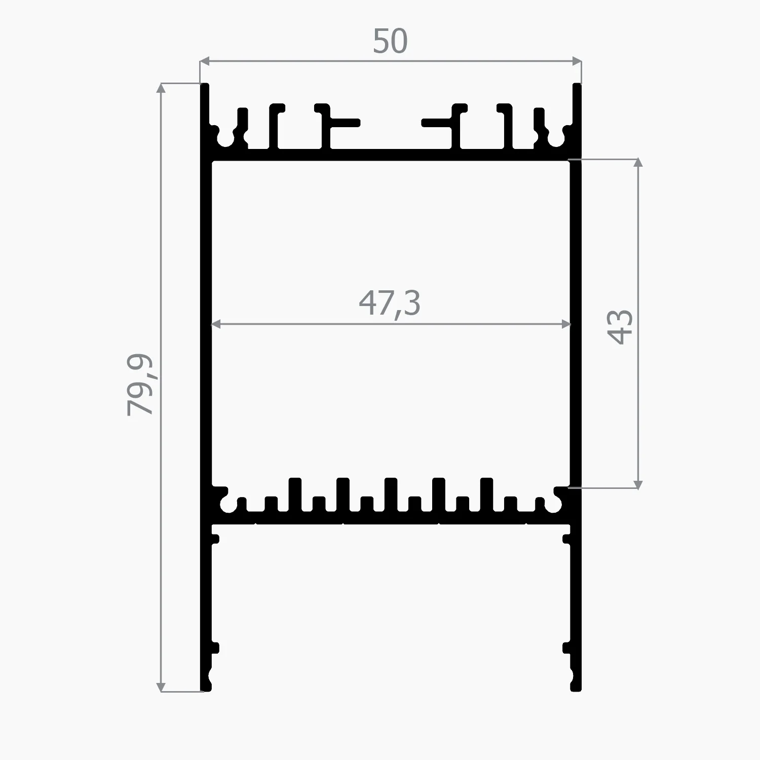 Materyal 6063-T5 Alüminyum (Çift Hazneli / Soğutuculu) Yüzey Statik Siyah Boyalı (RAL 9005) kaplamalı yüzey Dış Ölçüler 50 mm Genişlik × 79,9 mm Yükseklik LED Kanal İç Genişliği 45,4 mm (Çoklu sıra LED uyumlu) Boy Uzunlukları 100 cm, 200 cm ve 300 cm seçenekleri Özellik Profil İçi Trafo/Sürücü Saklama Haznesi Mevcut